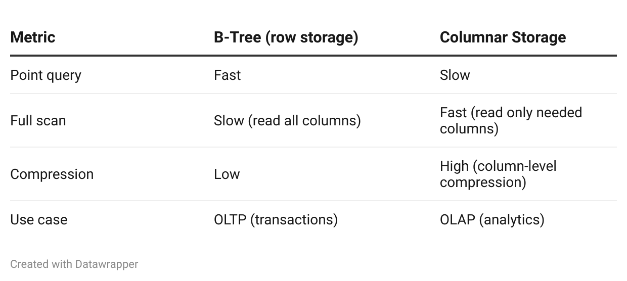 For large analytical queries scanning millions of rows, columnar storage (e.g., Parquet, ORC) outperforms B-Trees.