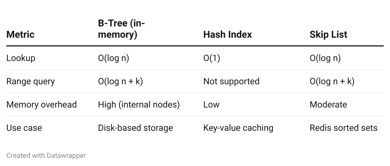 In memory, this is fast. Each comparison is a pointer dereference (~0.0001 milliseconds on modern CPUs). Total lookup: 0.002 ms.