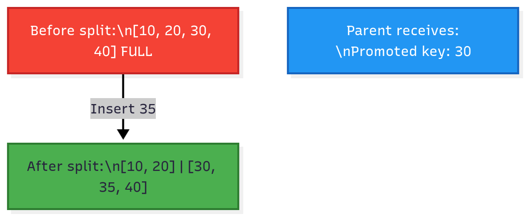 Insert 1 key → split leaf → split parent → split grandparent → split root