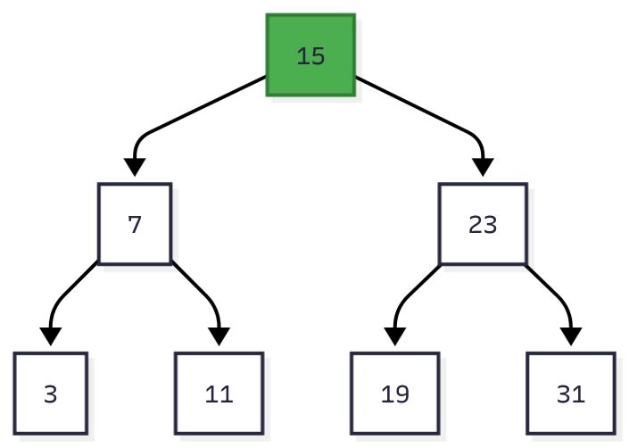 Figure 1: Binary search tree with 7 nodes. Finding key 11 takes 3 comparisons: 15 → 7 → 11.