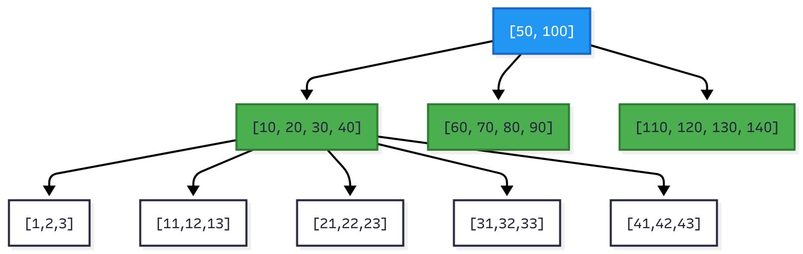 Figure 2: B-Tree with fanout ~100. Root has 2 keys and 3 children. Internal nodes have 4 keys and 5 children. Leaf nodes contain actual data.